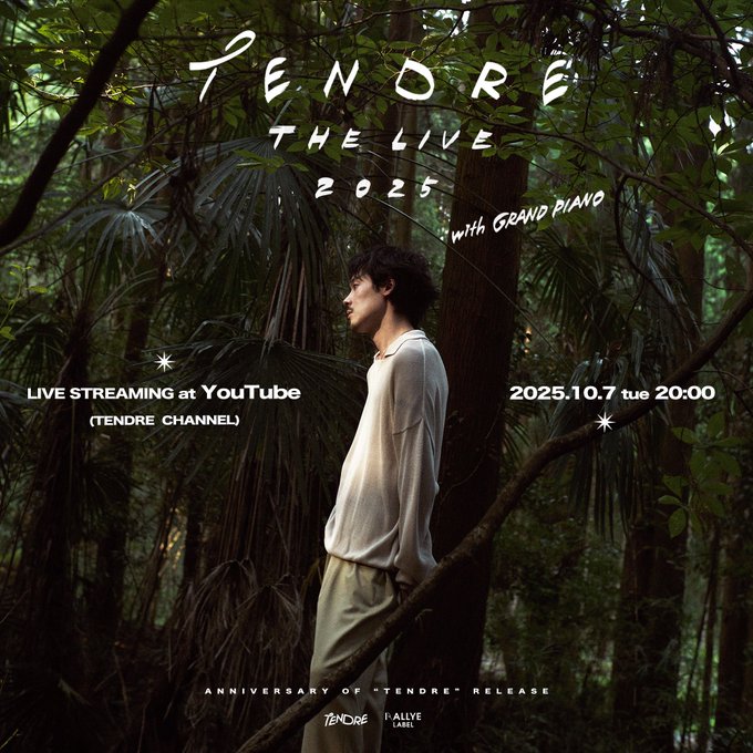 TENDRE:10/7(火) 20:00〜新作『TENDRE』のリリースを記念して グランドピアノとTENDREのみで演奏する YouTube生配信が開催